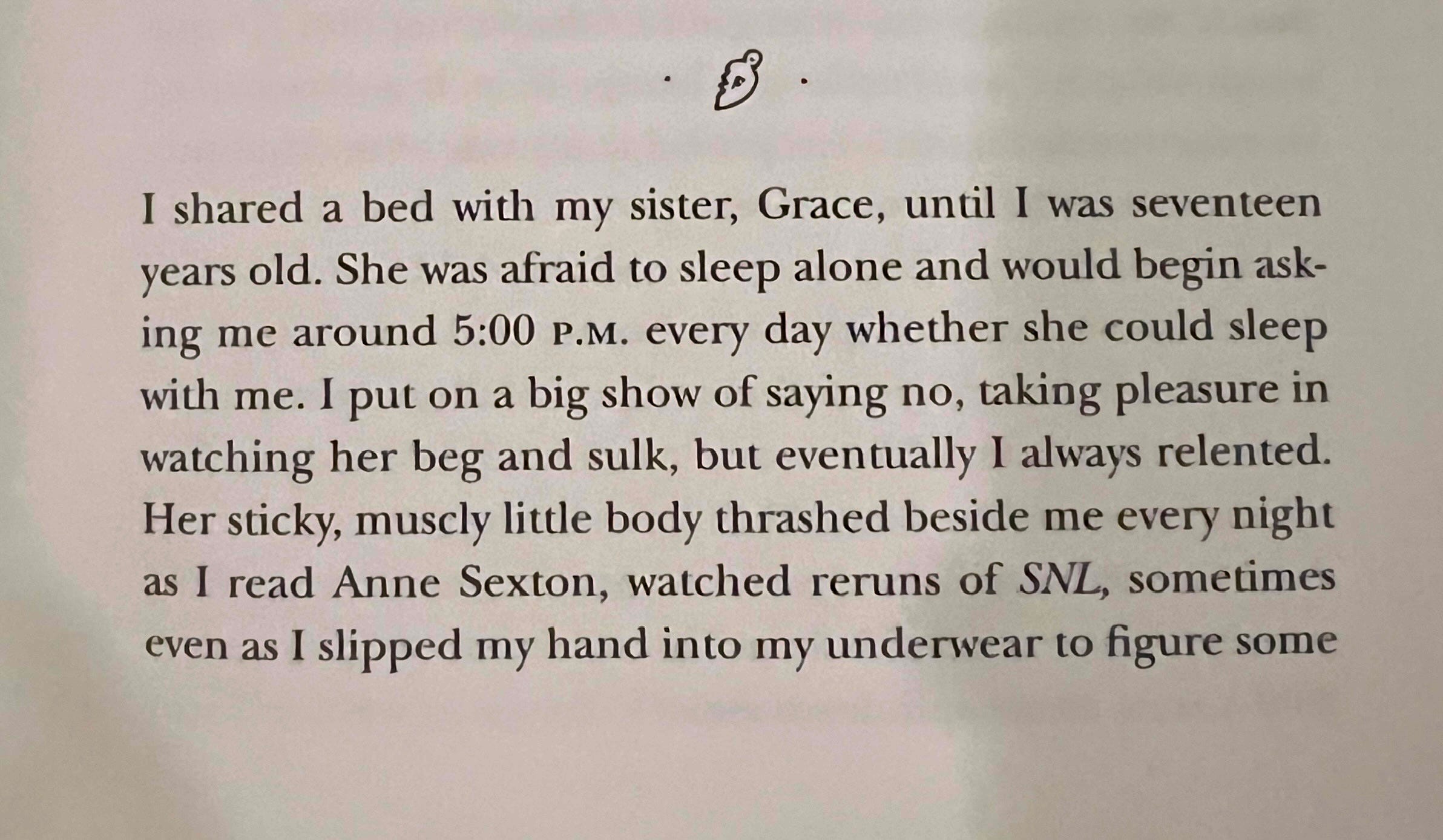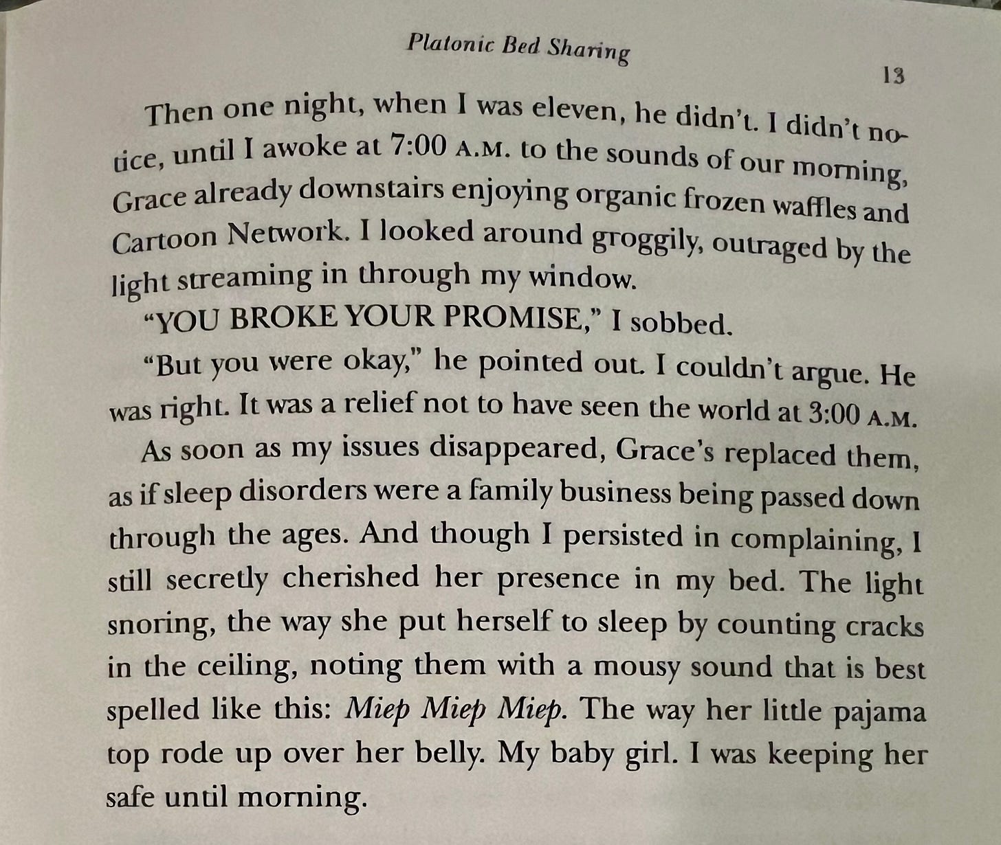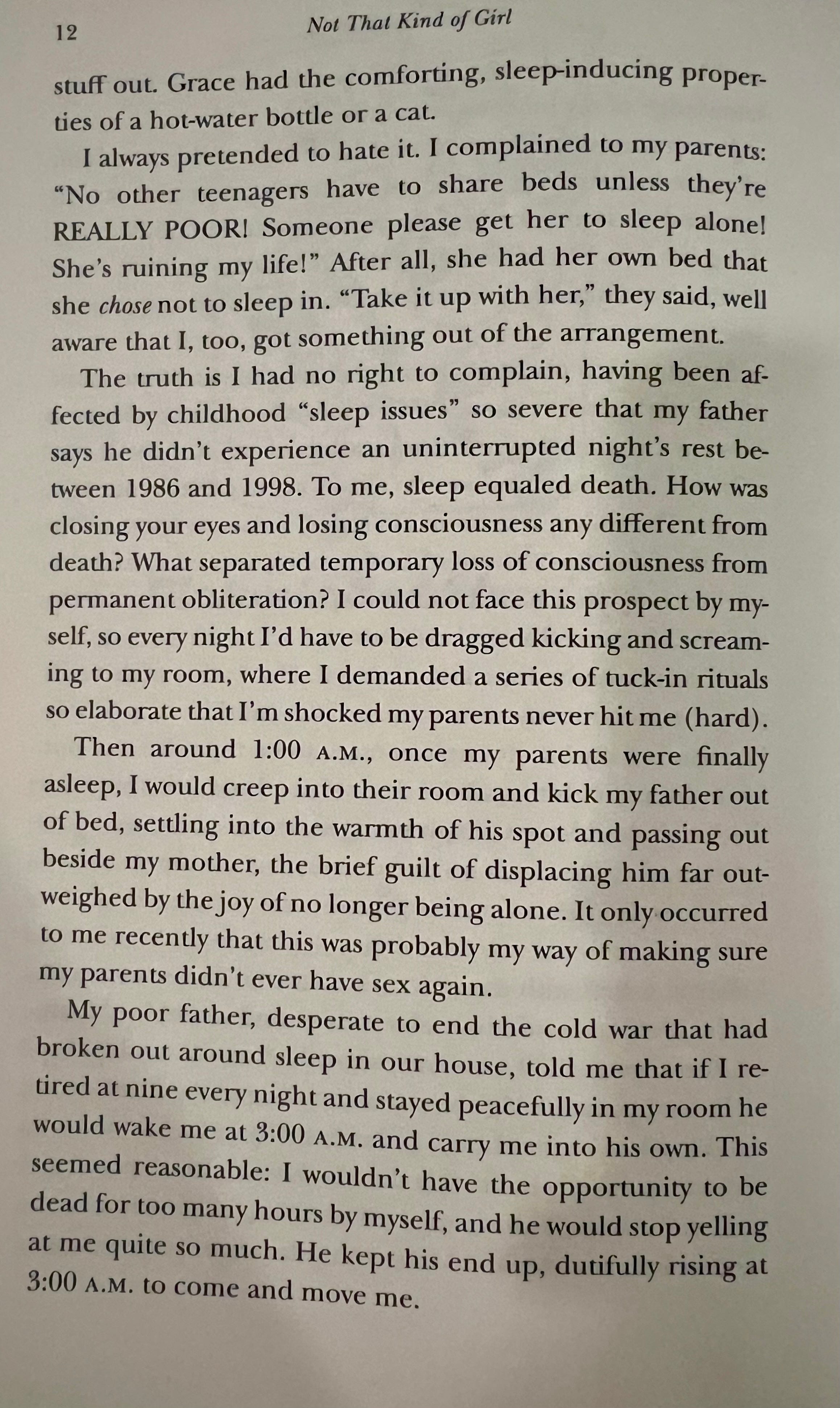 Not That Kind of Girl by Lena Dunham is lovely. I admire the steadiness of her voice. I just read the section about sleep issues in her family. She somehow makes them sound endearing—like a family tradition—but really, they're just sleep issues. She writes that sleeping alone was hard for her growing up.